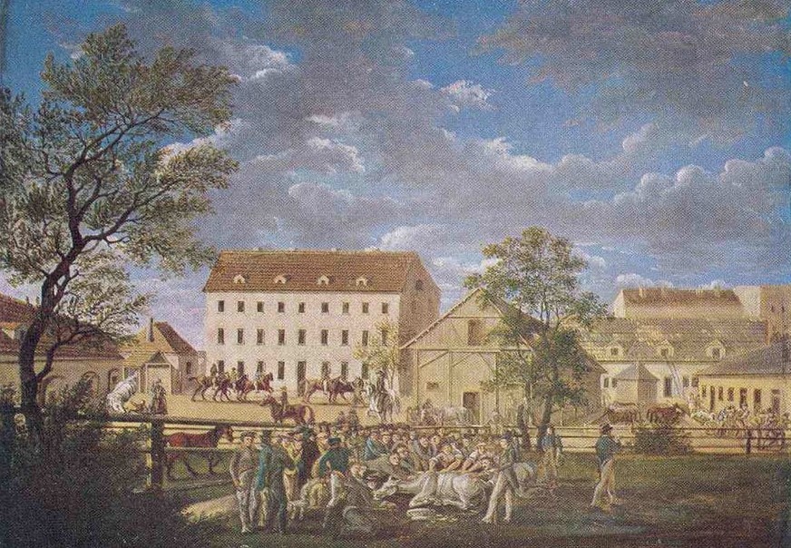 Nell’ epoca delle Scuole di Veterinaria quella di Vienna, (Veterinärmedizinische Universität) è stata la terza ad essere istituita nel 1765. Successivamente, nel 1777 l’Imperatore Giuseppe II “allo scopo di formare degli abili Medici atti a curare le Bestie in genere” fondò la Scuola di Veterinaria Militare e Spedale delle Bestie di Vienna. Il dipinto del 1783, di un anonimo pittore, che oggi proponiamo raffigura lo “spaziosissimo prato che alla buona stagione è uso al pascolo ai cavalli altresì alla ricreazione degli alunni” in cui si riconoscono gli studenti, trenta per corso, vestiti con “un’uniforme di panno grigio con paramani turchino” che assistono alle apprezzate lezioni del Prof. Giovanni Amedeo Wolstein, famoso direttore della scuola.