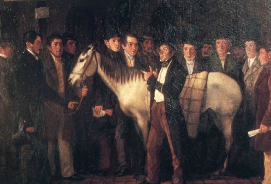Questa tela raffigura la lezione di un celebre professore viennese, Anton Hayne (1786-1853), che dal 1822 al 1852 fu docente presso l’Istituto di Medicina veterinaria di Vienna e direttore della Clinica medica. E’ qui raffigurato mentre elenca contandoli sulle dita i sintomi dell’emaciato cavallo, mentre i suoi allievi ascoltano attenti. Furono proprio loro, che si diplomarono nel 1834, a commissionare questo dipinto che li raffigurasse tutti insieme come dono ricordo per il professore. La Scuola viennese fu la terza, dopo quella di Lione e di Alfort, ad essere fondata nel 1765 per volontà dell’Imperatrice Maria Teresa, da Ludovico Scotti anch’egli allievo del Bourgelat .