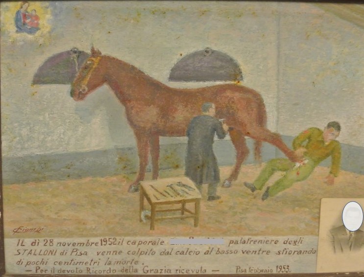 I richiami alla professione veterinaria ed alle attività ad essa ancillari non mancano nemmeno nell’arte popolare, come nel caso dei numerosissimi ex voto che adornano i molti santuari presenti in Italia. L’immagine di questa settimana è un ex voto presente nel santuario della Madonna delle Grazie di Montenero (Livorno) che illustra un “incidente sul lavoro” occorso ad un palafreniere (termine oramai desueto), mentre coadiuvava un maniscalco durante la ferratura.