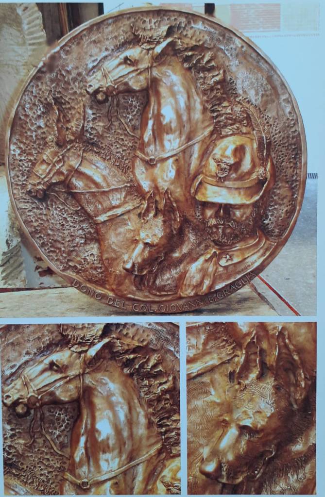 Il medaglione raffigurato nell’immagine intende ricordare tutti i caduti del Servizio Veterinario nella sede che, dopo la chiusura della Scuola del Corpo Veterinario Militare a Pinerolo, è diventata la casa madre del Servizio. È rappresentato un Alpino, in omaggio alla M.O. al Valor Militare alla Memoria cui è dedicata la caserma, Ten. Vet. Villy Pasquali, ma senza distintivo di grado e di specialità per abbracciare i militari di ogni grado e reparto che hanno militato e militano nel Servizio Veterinario. Le tre figure di animali, cavallo, mulo e cane, sono il doveroso omaggio alle truppe silenziose che hanno servito e servono nelle Forze Armate e che hanno copiosamente versato il loro sangue al fianco dei loro conducenti.