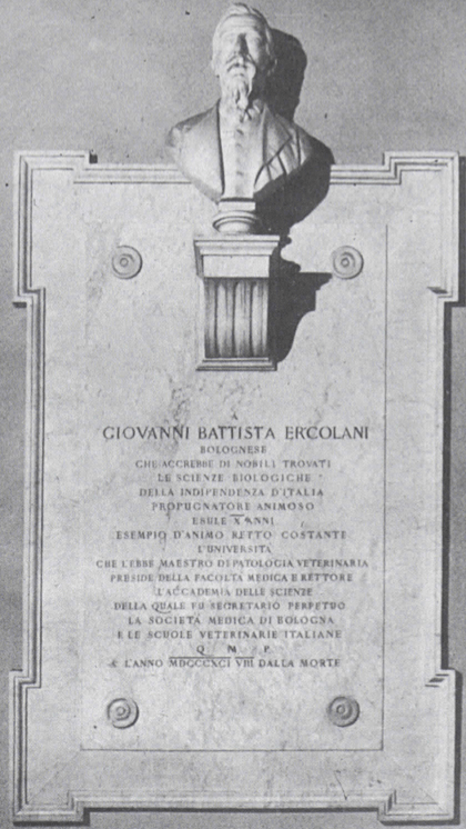 Giovan Battista Ercolani fu una delle figure di maggior spicco della Medicina veterinaria dell’800 e dell’Ateneo felsineo. Per commemorarne la memoria, il 4 novembre del 1891 nell’atrio della Regia Università di Bologna, a palazzo Poggi, al termine della cerimonia di inaugurazione dell’Anno Accademico alla presenza delle autorità Accademiche, Militari e Civili venne scoperto un busto in marmo di Carrara, opera dello scultore cav. Diego Sarti. L’epigrafe del ricordo marmoreo era stata dettata dal prof. Federzoni. Allo scoprimento dell’opera seguirono i discorsi del prof. Gerolamo Cocconi, direttore della Scuola, e del prof. Giovanni Generali.