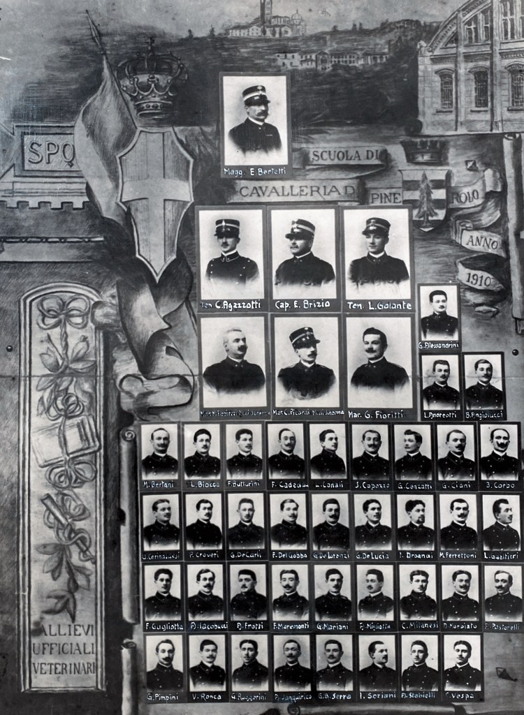Nel 1861, anno della costituzione del Corpo Veterinario Militare dell’Esercito Italiano, le regole di ammissione nell’Armata Sarda come veterinario prevedevano il superamento di un esame, previsto da una vecchia norma risalente al 1836, in cui dal 1855 fu richiesta anche una componente scientifica. Tale regola fu mantenuta fino al 1882 momento nel quale l’esame fu sostituito da una più semplice valutazione dei titoli. La prima foto di gruppo risale al 1910. A far tempo dal 1895 gli allievi ufficiali di complemento erano ospitati presso la caserma Principe Amedeo, in seguito intitolata a Dardano Fenulli, allora sede della Scuola di Cavalleria e oggi, in parte, sede del Museo storico della Cavalleria.