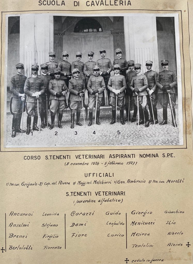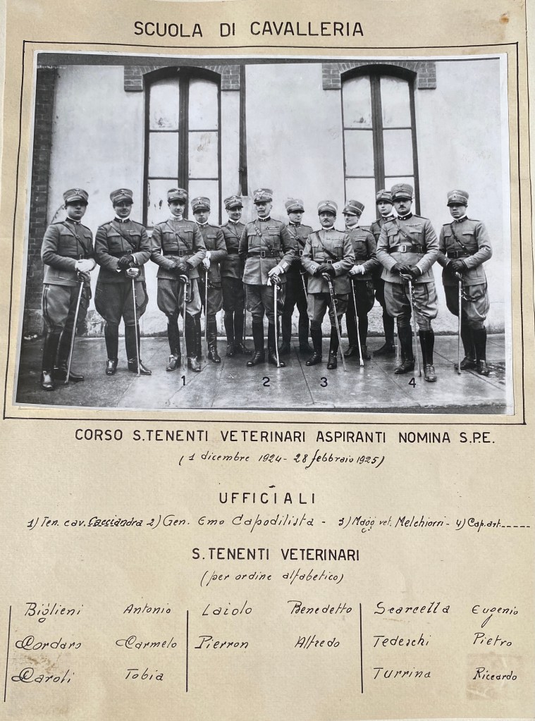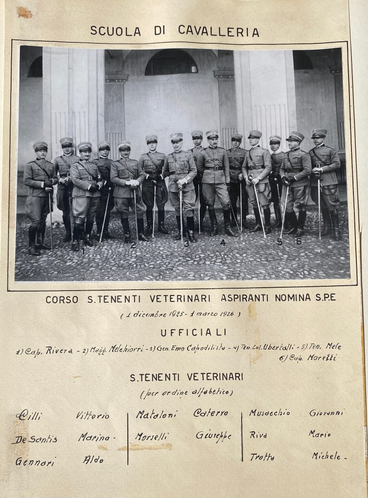 Si riconoscono, nelle foto ricordo dei corsi, futuri Capi del Corpo Veterinario (Riccardo Turina, Gino Paita, Gerardo Palma), celebri professori universitari (Prospero Masoero, Giovanni Godina, Carlo Pezzoli, Sebastiano Paltrinieri, Luigi Montroni, Telesforo Bonadonna, Vittorio Cilli, direttore dell’Istituto Siero-vaccinogeno dell’Asmara dal 1932 al 1946, e poi docente a Perugia di Malattie infettive ), Direttori di Istituto Zooprofilattico (Antonio Corrias), alcuni veterinari che subito dopo il corso emigrarono in Congo dove si distinsero nella professione (Carlo e Pio Roetti). In altre foto è difficoltoso leggere i nomi, ma sicuramente qualcuno potrebbe riconoscere i propri docenti o colleghi anziani o, ancora, padri e nonni. Il corso del 1937-1938 (cfr. foto 16) vide la partecipazione di un gruppo di corsisti provenienti dalla Sardegna. Tra questi, oltre al prof. Antonio Corrias, vi era anche il dott. Zenobio Cancedda (1913-1972). Sottotenente di prima nomina fu assegnato all’8° reggimento di artiglieria inquadrato nella divisione di fanteria “Del Pasubio”. Allo scoppio delle ostilità fu destinato sul fronte greco-albanese. Nel dopoguerra esercitò come veterinario condotto nel comune di Villaurbana e successivamente in quello di Sardara. Per molti anni fu presidente dell’Ordine dei Medici veterinari e componente del Consiglio Sanitario della Provincia di Cagliari.