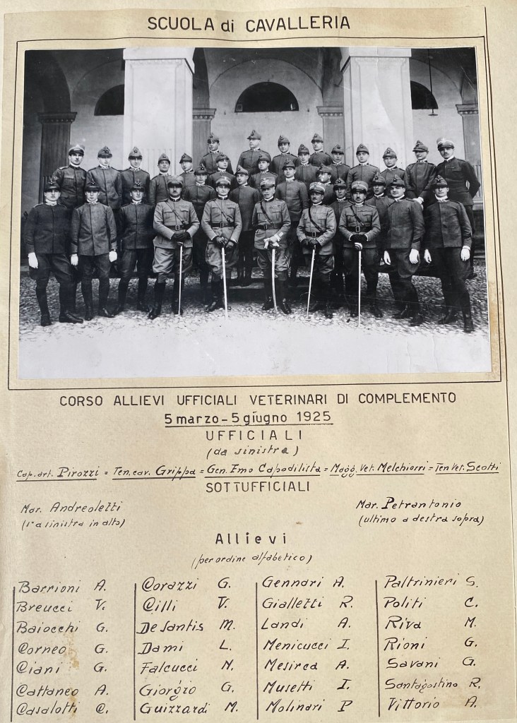 Qualche anno prima il corso era stato frequentato dal dott. Giovanni Dallari che, laureatosi nel 1905 presso la Scuola di veterinaria di Modena, nel 1906 era stato assegnato al 15° Reggimento artiglieria da campagna (all’epoca di stanza a Reggio Emilia). Promosso tenente nel gennaio del 1913 e quindi 1° capitano, nel marzo del 1919, con anzianità retroattiva dal 4 aprile 1918. Allo scoppio della Prima Guerra Mondiale venne trasferito a Cremona dove il suo compito era il controllo sanitario del bestiame, raccolto nei parchi buoi, diretto al Fronte per l’approvvigionamento delle truppe. Una volta congedato, rientrò a Fabbrico, dove era nato nel 1882, ed assunse il ruolo di Veterinario Condotto. Per molti anni fece parte del Consiglio Sanitario della provincia di Reggio Emilia e del Consiglio dell’Ordine provinciale dei Medici veterinari.