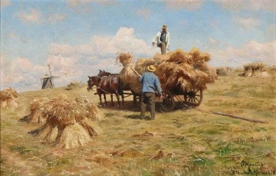 In una ideale continuazione con il tema di domenica scorsa vengono proposti due dipinti: il primo mostra la raccolta e il trasporto dei covoni di grano, mentre il secondo descrive il momento della trebbiatura e della macinatura svolto con l’ausilio dei buoi, che trainano un grosso rullo di pietra. Ancora ben lontani da qualsiasi norma igienico sanitaria! Si noti tuttavia come gli animali abbiano gli occhi coperti con un telo, tutto questo per cercare di proteggerli dal fastidioso “assalto” delle mosche intorno agli occhi.