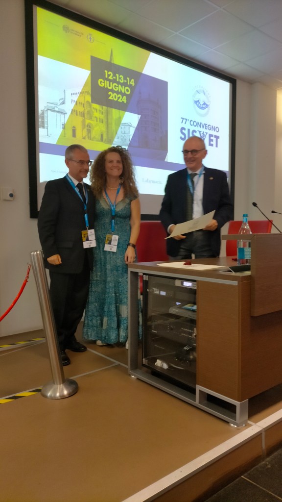 Infine è stato presentato un poster dal titolo Dai cani sanitari ai cani da salvataggio: storia di una collaborazione insostituibile. Il poster è stato premiato. Nell’immagine sottostante il vicepresidente S.I.S.Vet. prof. Paolo De Girolamo e la responsabile scientifica prof.ssa Alessia Di Giancamillo consegnano al presidente Mario. P. Marchisio l’attestato della premiazione.