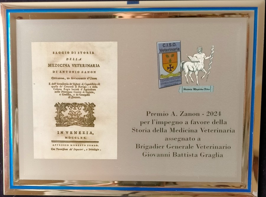 Il premio è stato attribuito al Brigadier Generale Veterinario Giovanni Battista Graglia che nel corso della lunga carriera ha sempre riservato particolare attenzione alla Storia della Medicina Veterinaria con particolare riguardo alle tradizioni del Corpo Veterinario Militare, alla salvaguardia e alla conservazione del patrimonio documentale, bibliografico e museale in possesso della Scuola Veterinaria del Corpo presso la sede di Pinerolo e, successivamente, a Grosseto dove la Scuola è stata trasferita. Stante l’assenza del Generale Graglia, dovuta ad un contrattempo, la consegna del premio avverrà in un prossimo momento.