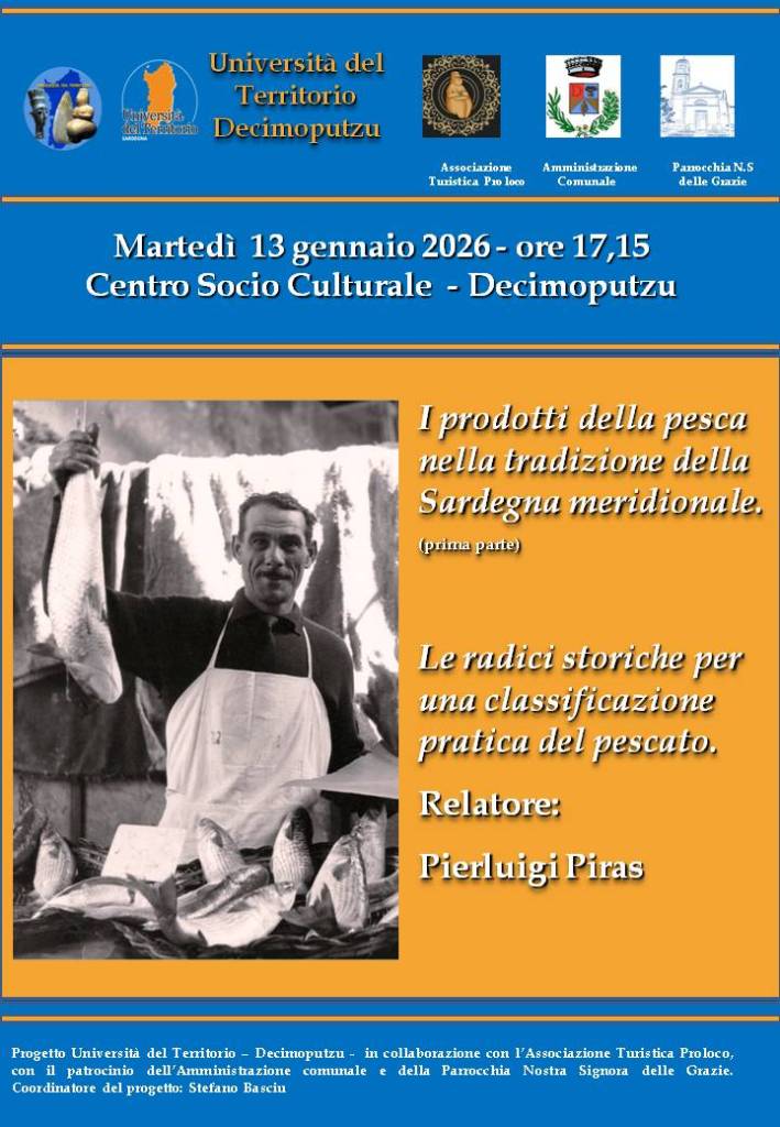 Il prossimo 13 gennaio 2026 alle ore 17,15 il socio dr. Pierluigi Piras terrà una conferenza presso il Centro Socio Culturale de Decimoputzu (SU). Il tema affrontato verterà sui prodotti della pesca nella tradizione della Sardegna meridionale.