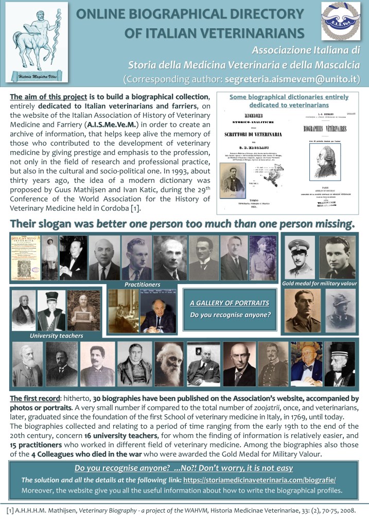 La storia della veterinaria si rappresenta anche attraverso la vita degli uomini che vi si sono coinvolti e ne sono stati più partecipi. Con questa raccolta di informazioni biografiche, confidando che molti possano e vogliano contribuire, si punta a costruire un archivio di notizie relative a quanti, veterinari e non, hanno contribuito allo sviluppo della Medicina veterinaria e della Mascalcia dando lustro e risalto alla professione non solo nell’ambito della ricerca e della pratica professionale, ma anche in quello culturale e socio politico. L’auspicio è che questo dizionario biografico possa diventare di utilità nell’intento di ricostruire tutto quel patrimonio di risorse umane che hanno contribuito alla crescita della Medicina veterinaria e della Mascalcia, ma di cui spesso ci si dimentica. L’idea non è nuova e trae spunto da analoga iniziativa internazionale promossa nel 1993 da Ivan Katic e Guus Mathijsen della World Association for the History of Veterinary Medicine. Il loro motto era better one person too much than one person missing.