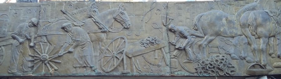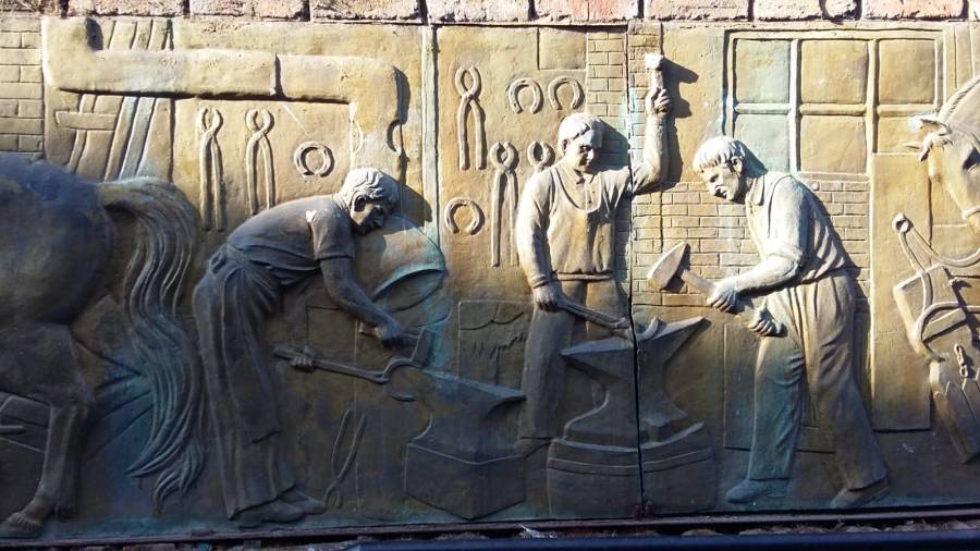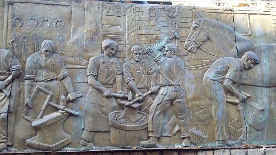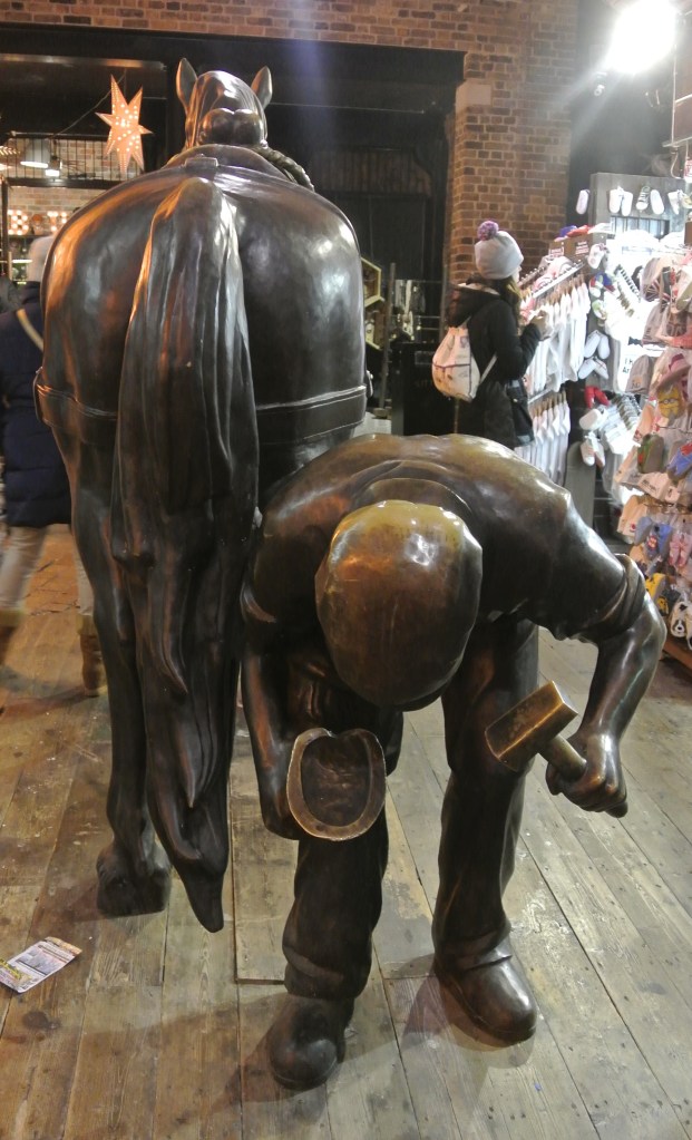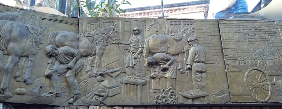 La grande tela, due metri per tre metri, fu dipinta da Emile Seeldrayers (1847-1933) tra il 1884 ed il 1886. Nel 1893 fu esposta all’Esposizione delle Belle Arti, Commercio ed Industria di Anderlecht (Belgio). Alla conclusione della rassegna il dipinto fu acquisito dal Comune di Anderlecht. Nel 1961 fu donato alla Scuola Veterinaria Cureghem (Bruxelles), in occasione delle celebrazioni per il 125° anniversario della fondazione, che la collocò all’interno della sala riunioni della Scuola. In seguito, nel 1992, stante la fusione della Scuola Veterinaria di Cureghem con quella di Liegi, fu spostata al campus di Sart Tilman, in prossimità di Liegi, dove si trova tuttora. La tradizione orale vuole che la tela raffiguri una scena all’interno dei vecchi locali della Scuola. Oltre al pubblico, sono presenti alcuni cavalli, una forgia a disposizione degli studenti. Sulla destra è chiaramente visibile un professore, con la mano sinistra sollevata e l’indice teso, intento ad impartire la lezione su un cavallo. Dovrebbe trattarsi del prof. Lambert Hendrickx, abbigliato come si usava all’epoca con la tuba sul capo ed una fluente barba. Sulla sinistra della scena, si osserva un signore con la bombetta il cui cappotto ha il collo ricoperto di pelliccia: si tratterebbe del sig. Georges Moreau borgomastro di Anderlecht dal 1884 al 1919. Al centro del quadro la sig.ra Moreau, con un cagnolino in braccio, e due ragazze. Il dipinto ha acquisito grande notorietà nel momento in cui è stato riprodotto nella sovraccoperta del testo “Veterinary Medicine: An Illustrated History” di R. Dunlop e D. Williams.