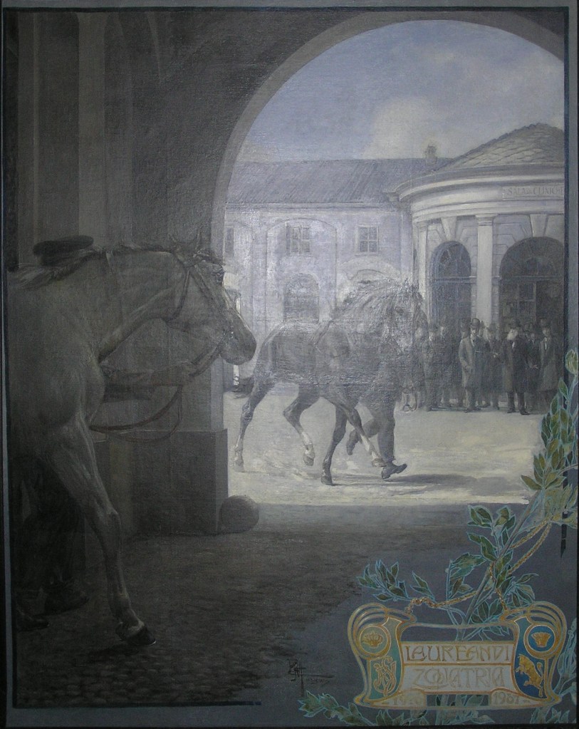 Nell’ epoca delle Scuole di Veterinaria quella di Vienna, (Veterinärmedizinische Universität) è stata la terza ad essere istituita nel 1765. Successivamente, nel 1777 l’Imperatore Giuseppe II “allo scopo di formare degli abili Medici atti a curare le Bestie in genere” fondò la Scuola di Veterinaria Militare e Spedale delle Bestie di Vienna. Il dipinto del 1783, di un anonimo pittore, che oggi proponiamo raffigura lo “spaziosissimo prato che alla buona stagione è uso al pascolo ai cavalli altresì alla ricreazione degli alunni” in cui si riconoscono gli studenti, trenta per corso, vestiti con “un’uniforme di panno grigio con paramani turchino” che assistono alle apprezzate lezioni del Prof. Giovanni Amedeo Wolstein, famoso direttore della scuola.