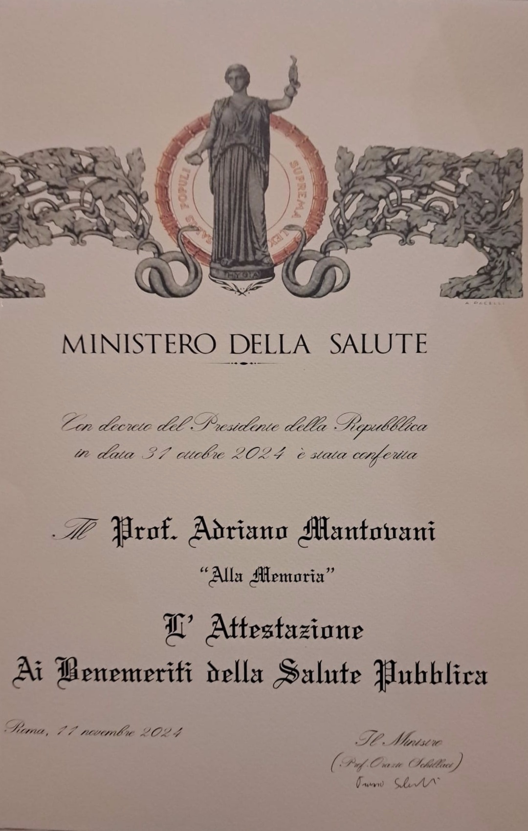 Nello scorso mese ottobre, su proposta del CeRVEnE e della Fondazione MIdA, il Presidente della Repubblica Sergio Mattarella, ha riconosciuto l’attestazione ai Benemeriti della Salute Pubblica al professore Adriano Mantovani per onorare la sua memoria e il lavoro svolto nell’ambito dell’epidemiologia e della disastrologia veterinaria. Un grande plauso va al dott. Raffaele Bove, direttore tecnico del CeRVEnE, per aver promosso l’iniziativa. Ai tanti meriti del prof. Adriano Mantovani va riconosciuto anche quello di essere stato un grande appassionato della Storia della Medicina Veterinaria che nel 2004 era stato premiato con la Cheiron Medal dell’Associazione mondiale di Storia della Medicina Veterinaria.